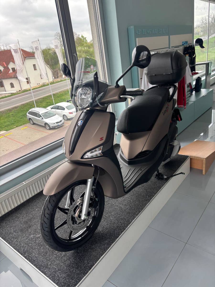 Nabízíme nový skútr Piaggio Liberty 125 v hnědé matné barvě. Včetně kufru a předního plexi štítu.